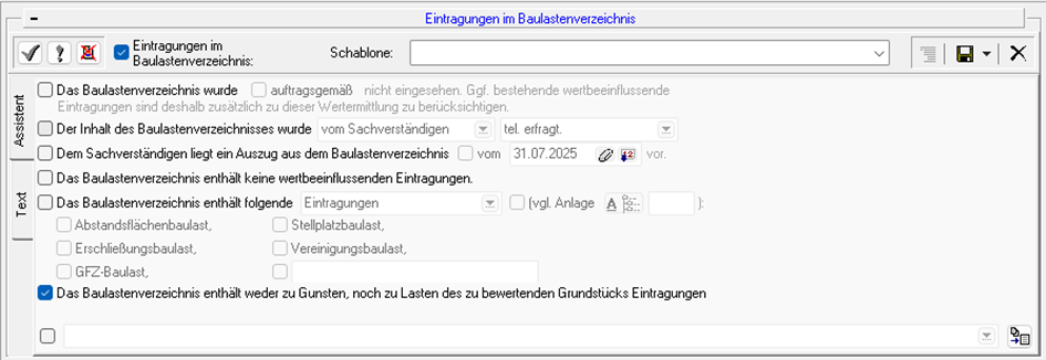 Zur Vermeidung unerwünschter Nachfragen zum Thema Baulasten wurde in ProSa-Text der Beschreibungspunkt „Eintragungen im Baulastenverzeichnis“ um ein weiteres Optionsfeld ergänzt.