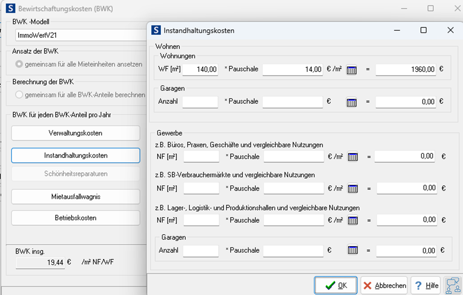 Die Eingabe der Instandhaltungskosten für gewerbliche Nutzungen wurde an die Anlage 3 der ImmoWertV angepasst.
