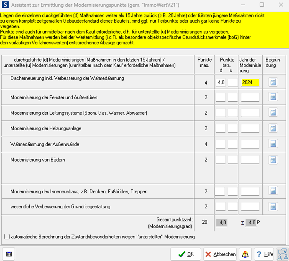 Damit zukünftig auch das Modernisierungsjahr des einzelnen Gewerks im Gutachten dargestellt werden kann, wurde der Assistent zur Ermittlung der Modernisierungspunkte um die Spalte „Jahr der Modernisierung“ erweitert.