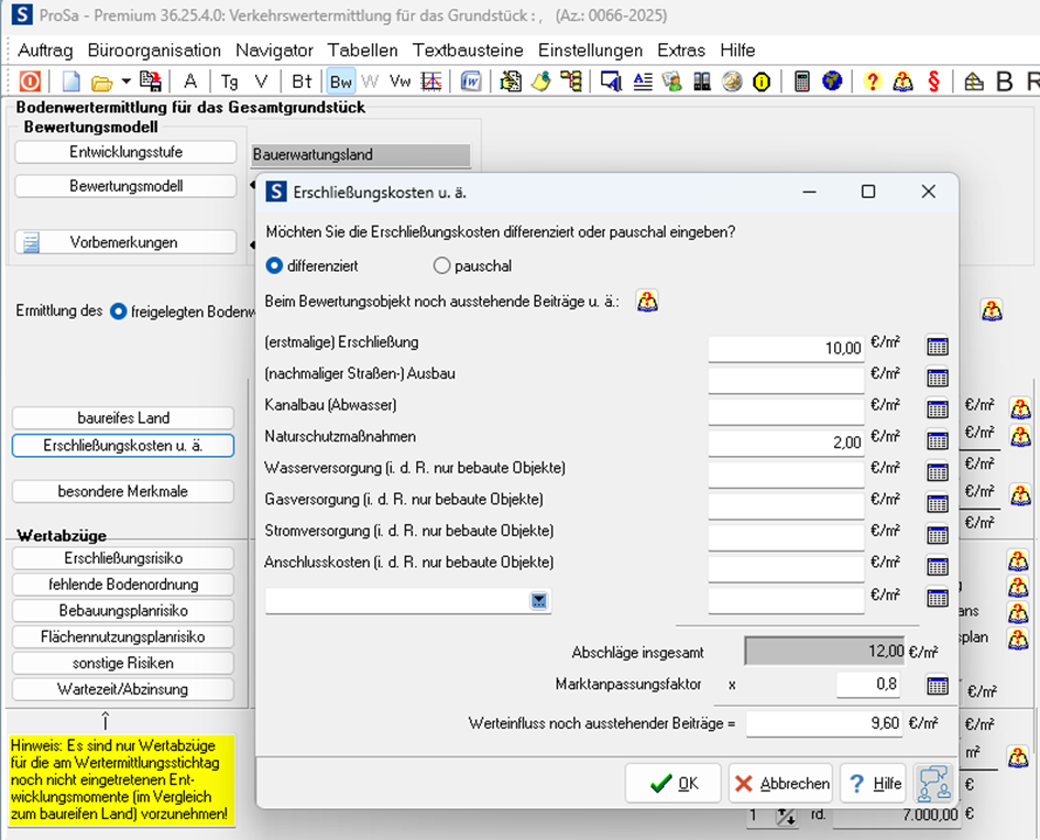 Im Zusammenhang mit der deduktiven Bodenwertermittlung können ab sofort die Werteinflüsse der Abschläge für die Erschließungsbeiträge u.ä. mittels Marktanpassung umgerechnet werden.