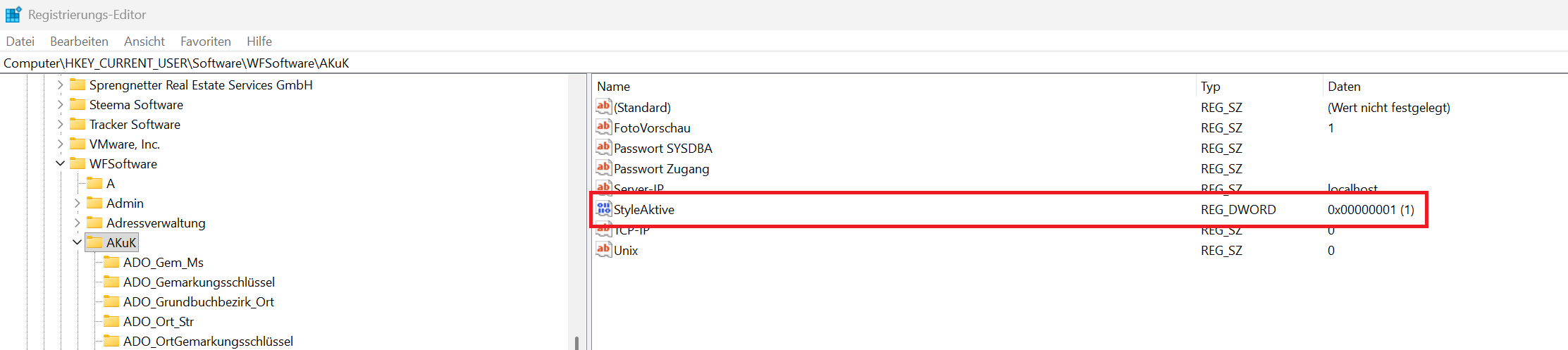 Um das Design zu testen, muss in der Registry unter HKEY_CURRENT_USER\Software\WFSoftware\AKuK der Eintrag StyleAktive hinzugefügt und mit einer 1 aktiviert werden.