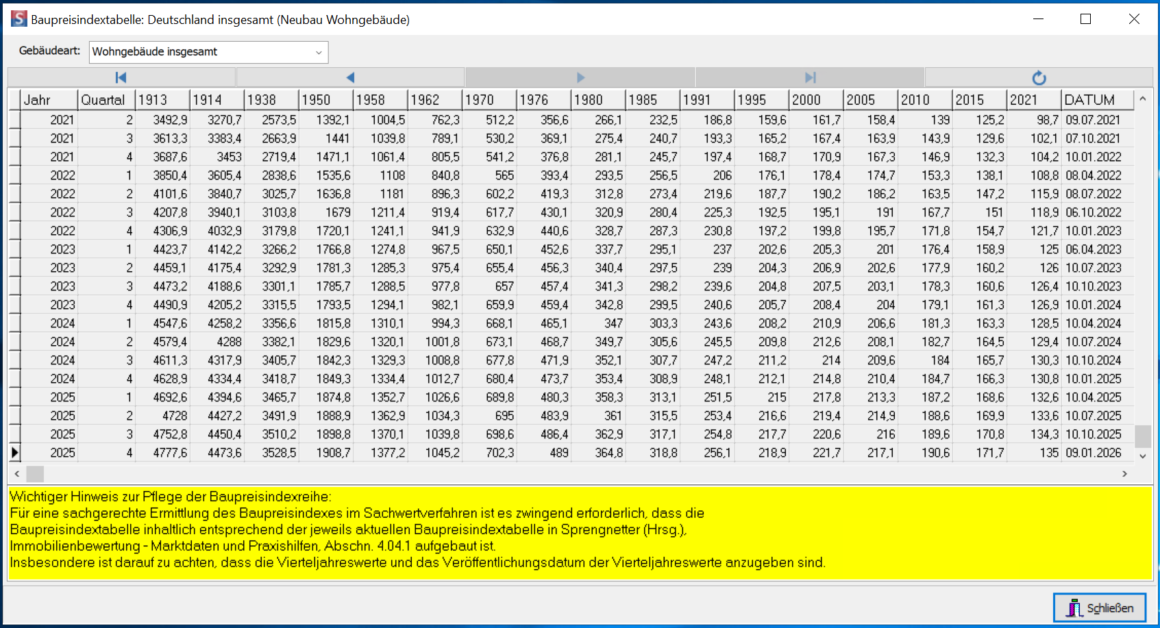 Im Programm werden die Nachschlagetabellen nicht mehr aktualisiert, aktuelle Werte können aus der Datenbank über die Menüschaltfläche Extras --> Quellen/Datenbanken --> Baupreisindex eingesehen werden.