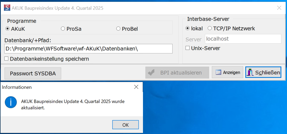 Im Programm werden die Nachschlagetabellen nicht mehr aktualisiert, aktuelle Werte können aus der Datenbank über die Menüschaltfläche Extras --> Quellen/Datenbanken --> Baupreisindex eingesehen werden.